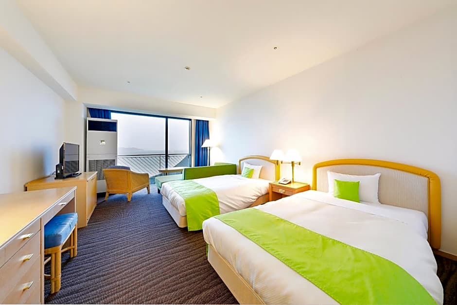 The spacious twin room provides air conditioning, a wardrobe, a balcony with sea views as well as a private bathroom featuring a bath.